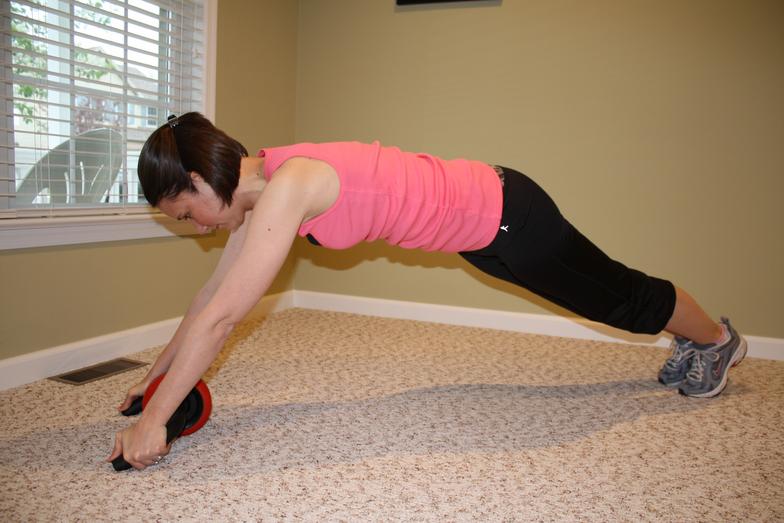 From a kneeling position, select a grip position that will allow you to perform Roll Stops. Lower your chin towards chest, and slightly crunch your abdominal muscles without excessively arching your back. Tilt wrists until handle ends are off floor and roll the Extreme Ab & Arm Wheel forward 6 inches and stop your roll by simply tilting handle ends to floor. Contract abdominal muscles and hold for 5 seconds. Lift handle ends up off the floor and roll forward 6 more inches. Contract abdominal muscles and hold for 5 seconds. Crunch back to starting position and repeat for 2 more repetitions of Plank Core Strengtheners using Roll Stop.